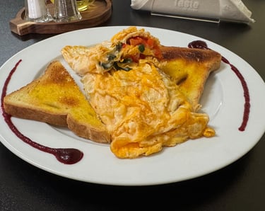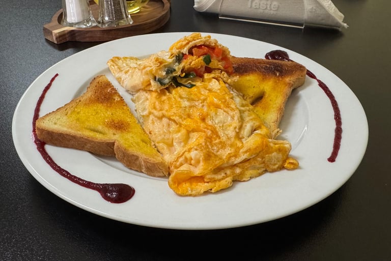 Omelete relleno de jamón, queso, tomate, cebolla, chile dulce, albahaca y culantro, acompañado de una tostada crujiente.